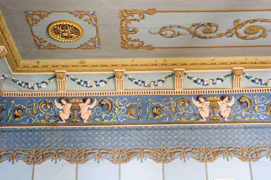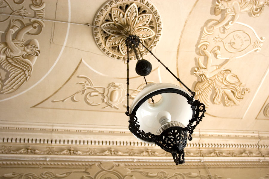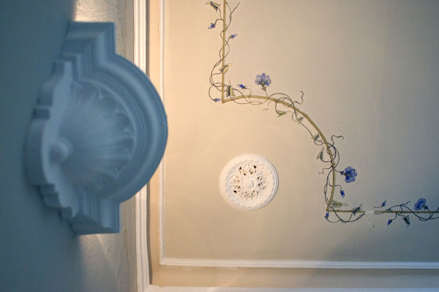 Unfortunately, water damage had destroyed large sections of the frescoes in the formal dining room. The restoration of this room was particularly challenging needing five different passes with the various colours to complete the intricate design. If you look closely at the ceiling in this room you can see that whatever image was originally in the ovals has been removed somewhere along the history of the home. Just why remains a mystery and we have to chosen to leave this section "untouched" as a reminder of the house's past.