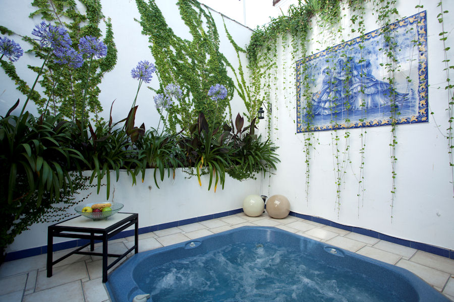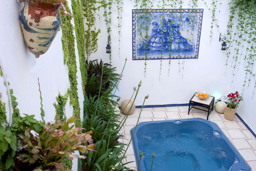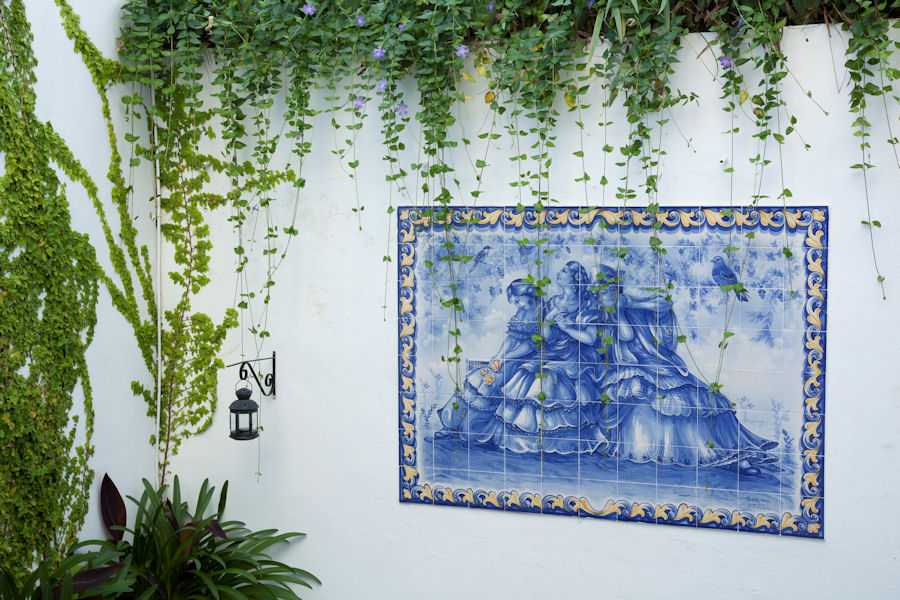 Rambling ficus and cascading vines surround the hand painted tiles of swooning Spanish ladies that were inspired by a sculpture in the Maria Luisa Park in Seville.